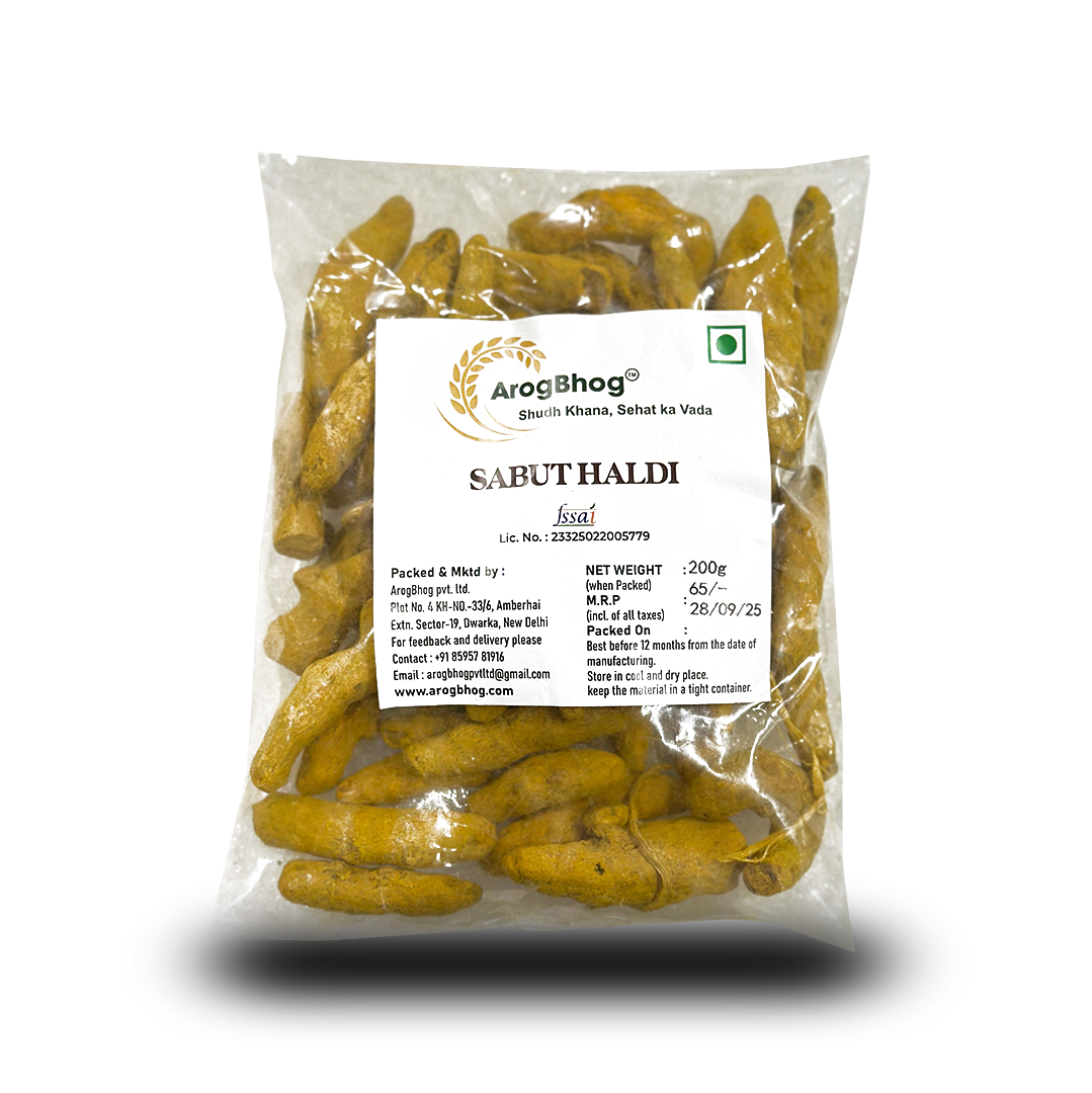 Bring the power of purity to your kitchen with Arogbhog Sabut Haldi. Our whole turmeric roots are sun-dried and naturally preserved, retaining their rich golden color and strong aroma. Known for its anti-inflammatory and medicinal properties, turmeric is a staple in Indian households for both cooking and wellness. Use it to grind fresh turmeric powder at home or for traditional remedies. Arogbhog guarantees authenticity, ensuring no additives or artificial enhancements. Experience the difference of true haldi—raw, natural, and powerful in every way.
