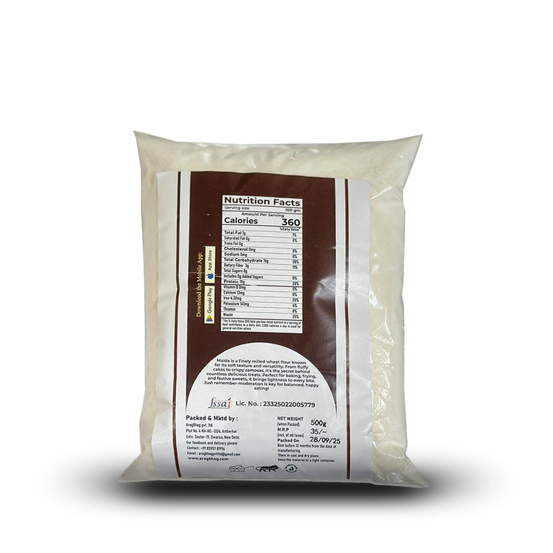 The Fact is: The chemicals used to bleach "market maida" are known to be harmful to the pancreas and gut lining. Because ArogBhog Maida is processed without these bleaching agents, it remains a much "cleaner" starch. It is slowly milled to ensure the heat doesn't damage the natural gluten structure. This results in a flour that gives you the perfect stretch for bhaturas and the ideal fluff for cakes, without the chemical aftertaste or the inflammatory response caused by industrial bleaches.